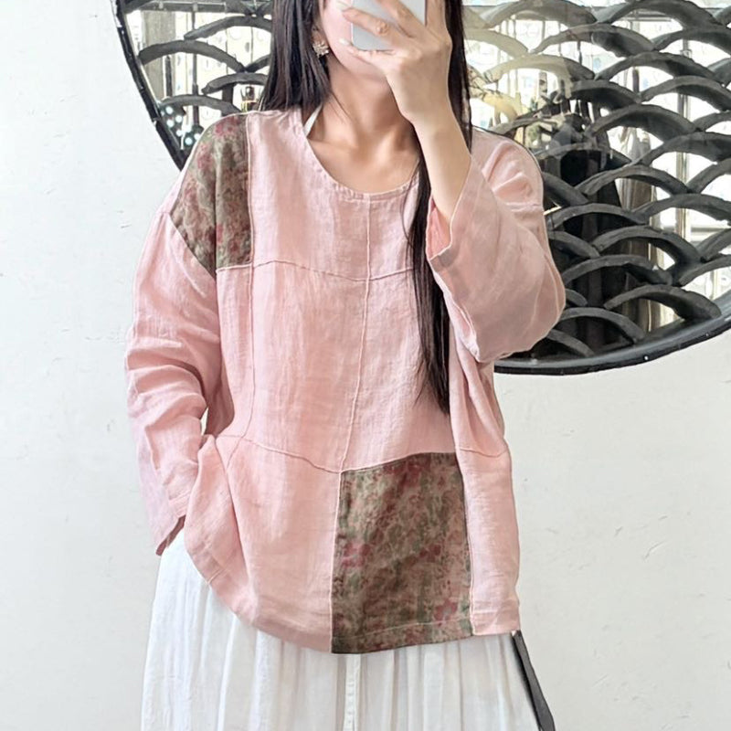 Áo T-shirt linen dài tay cổ tròn phối ô vuông hoa lá - A981
