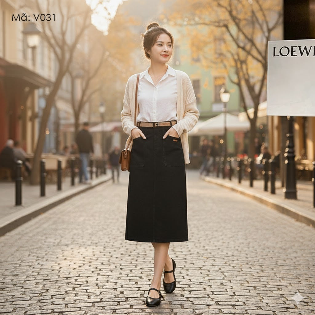 Chân váy retro lưng cao túi vuông kèm thắt lưng - V031