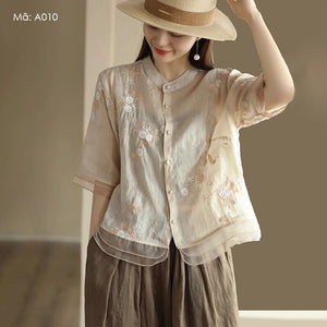 Áo sơ mi organza ngắn tay cổ tròn thêu hoa lá - A010