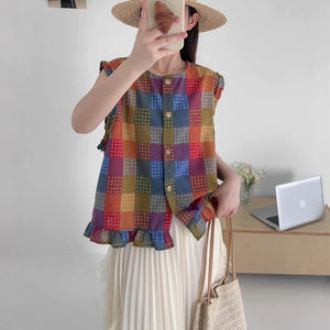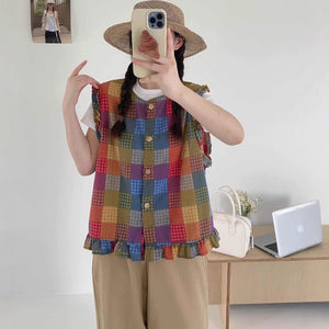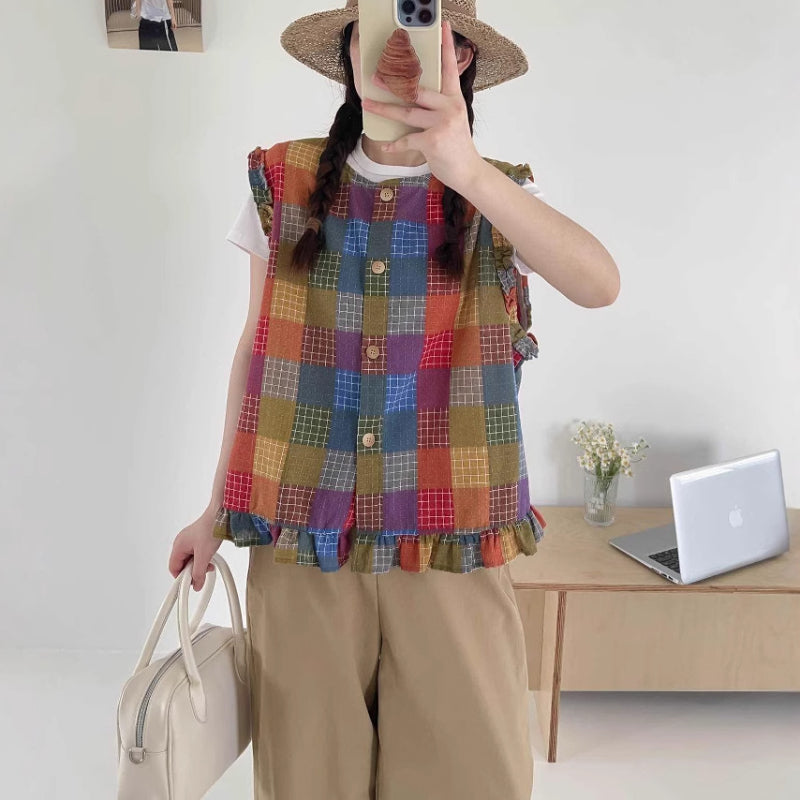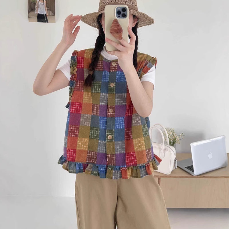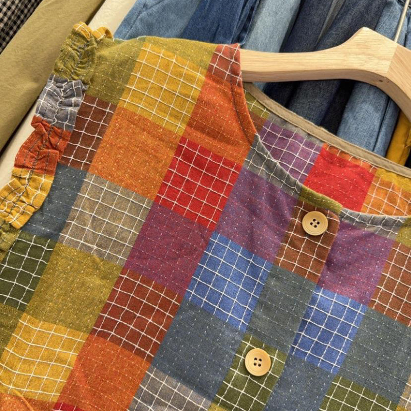 Áo sơ mi sát nách cổ tròn kẻ caro sắc màu - A885