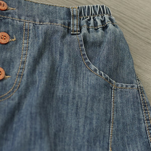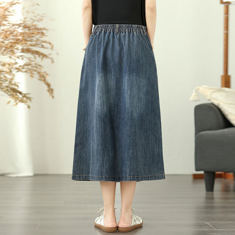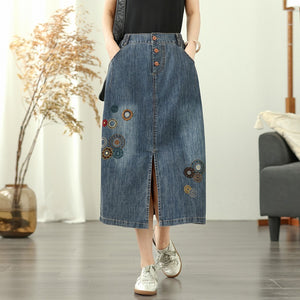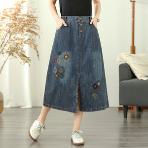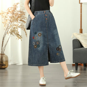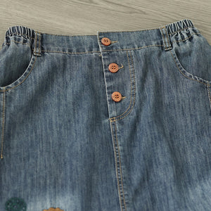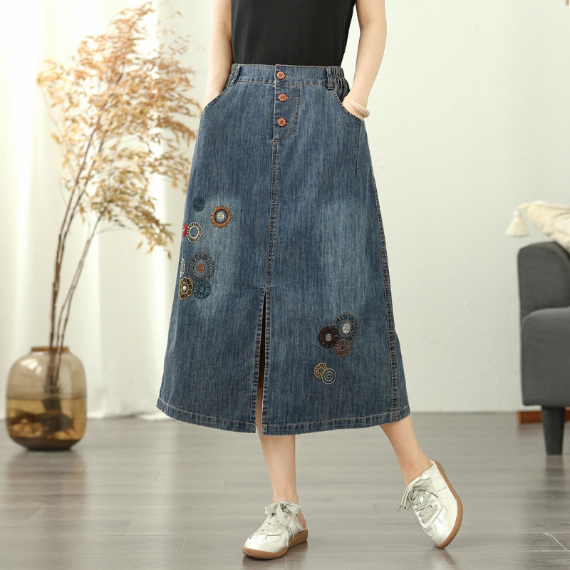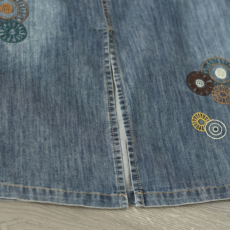Chân váy denim lưng thun thêu những vòng tròn trừu tượng - V105