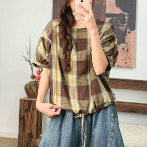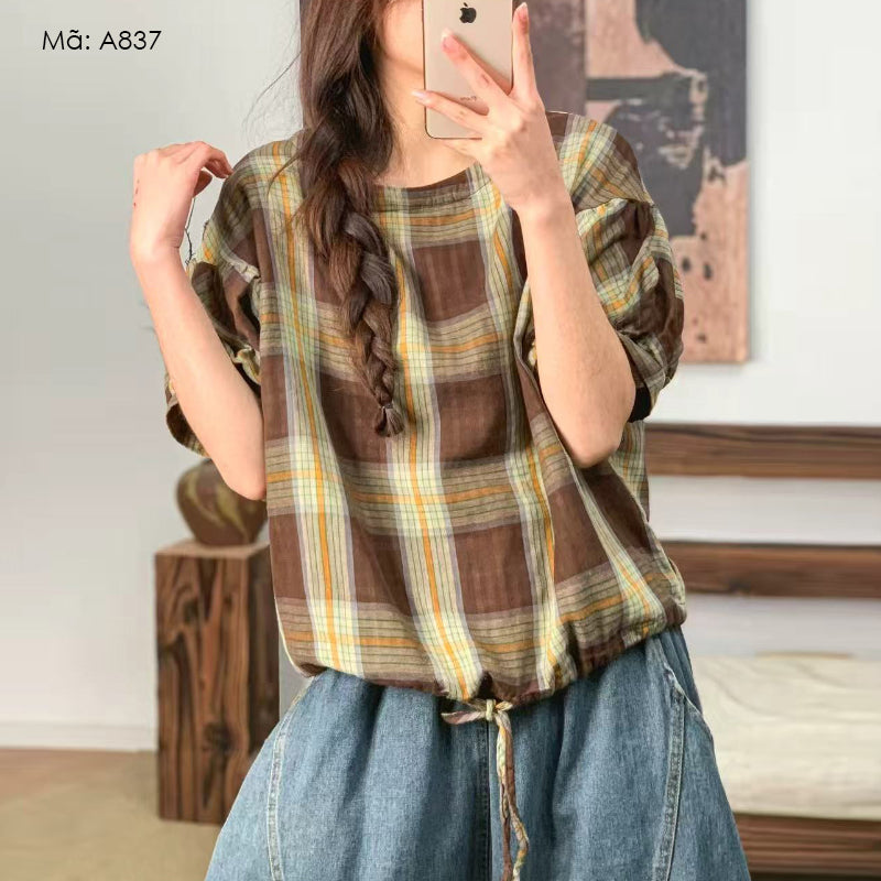 Áo sơ mi linen ngắn tay cổ tròn kẻ caro vạt bo dây rút - A837