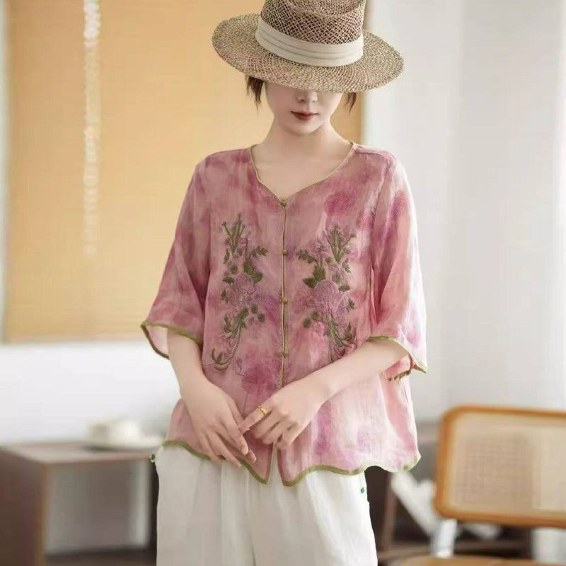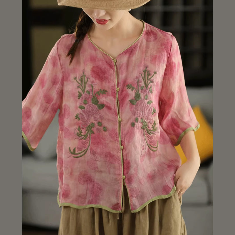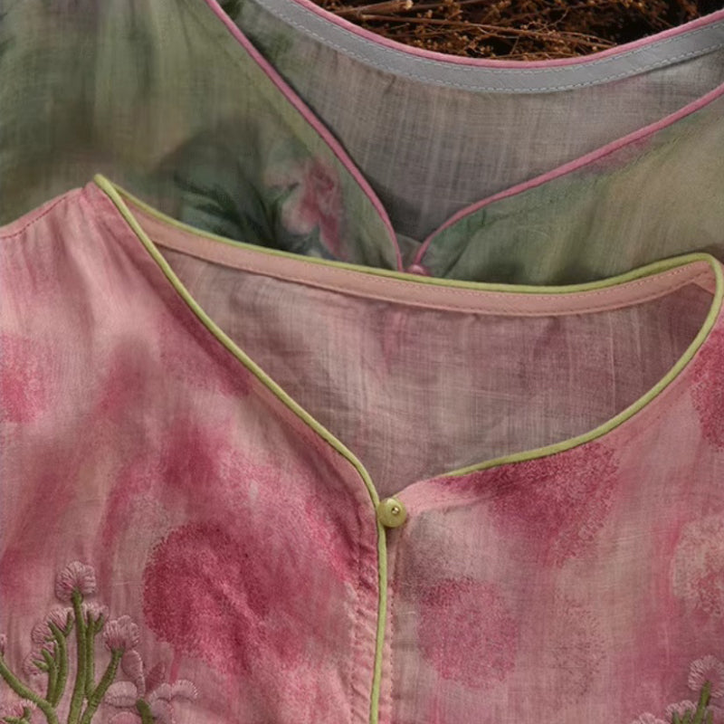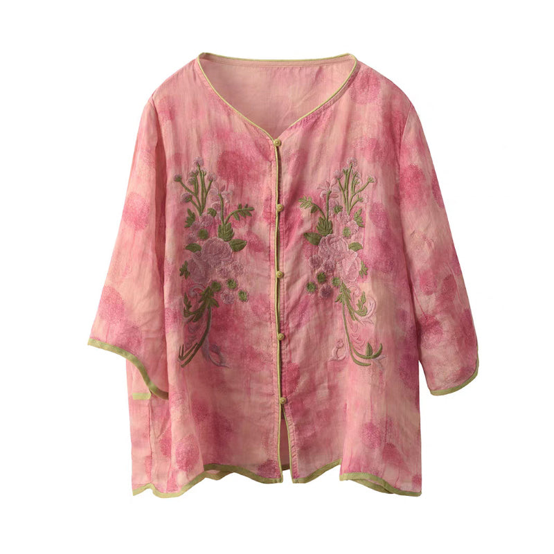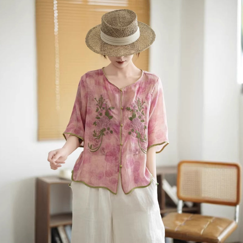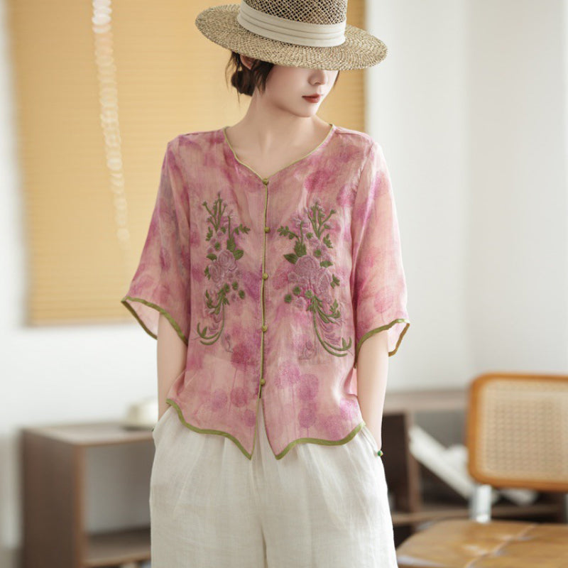 Áo sơ mi linen ngắn tay thêu hoa - A1382