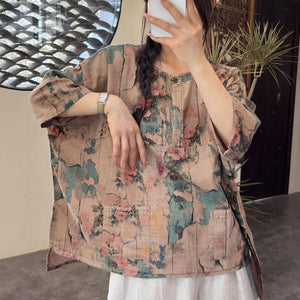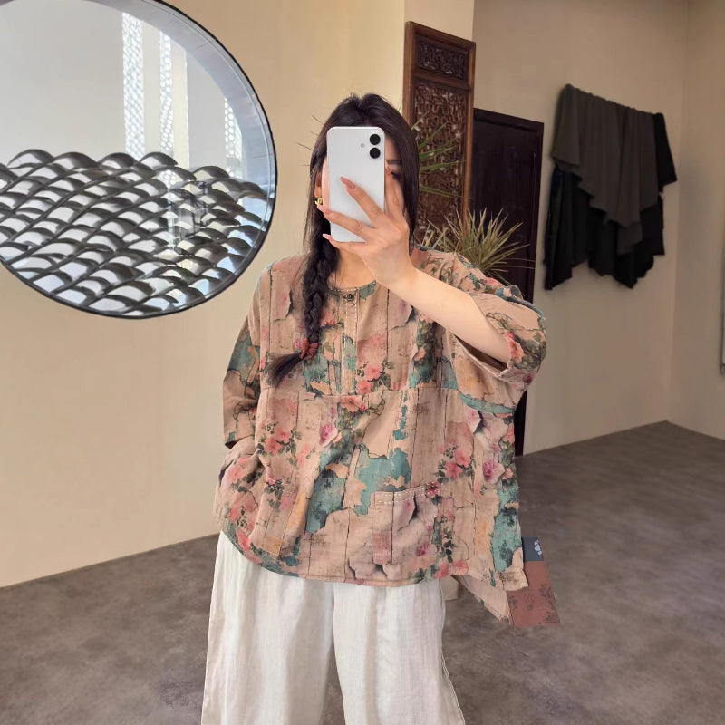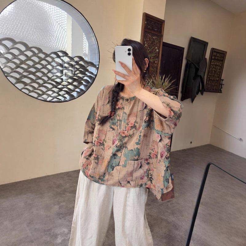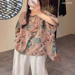 Áo sơ mi ngắn tay cổ tròn hoa văn retro hai túi vuông - A970