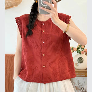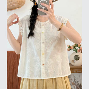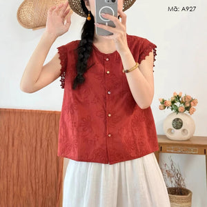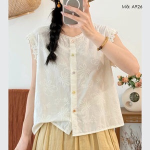 Áo sơ mi sát nách cổ tròn thêu ren hoa lá - A926