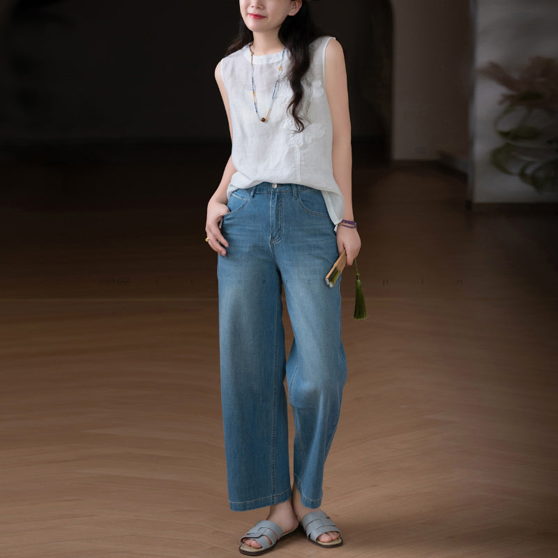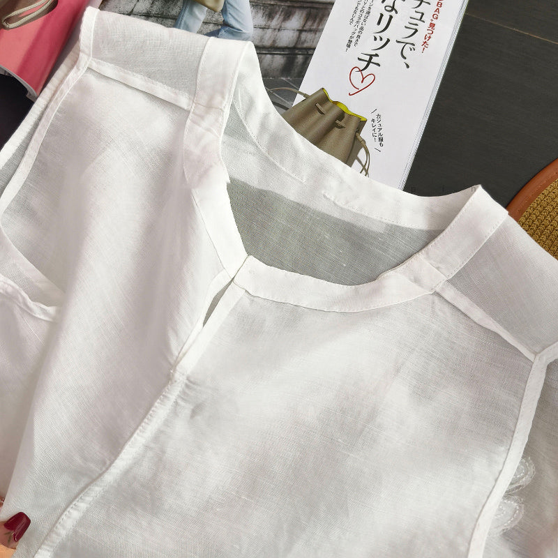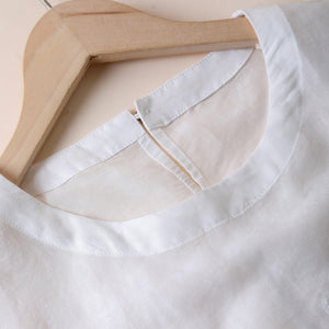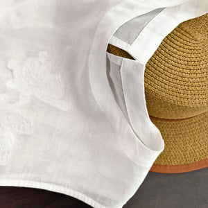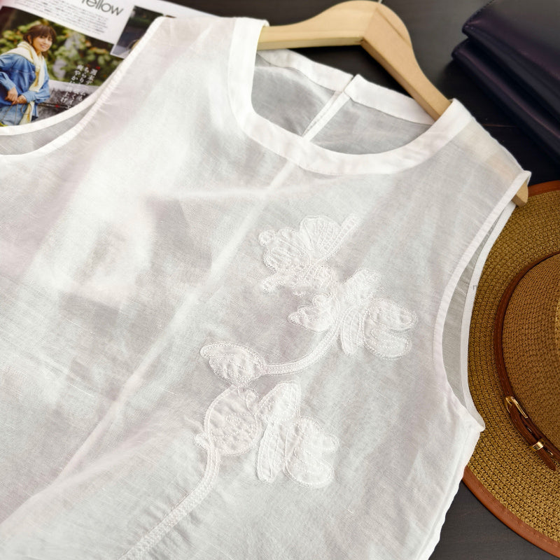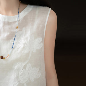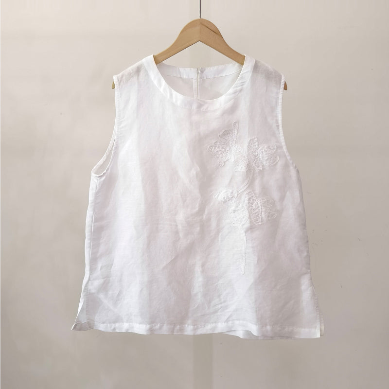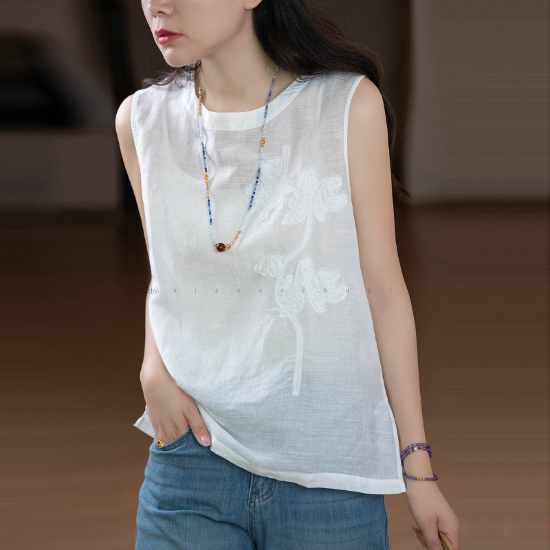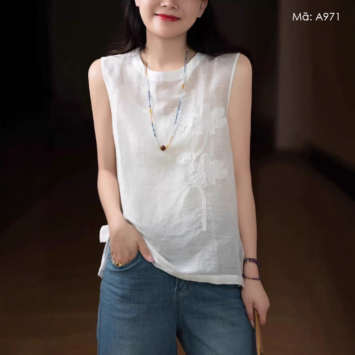 Áo T-shirt linen sát nách cổ tròn thêu retro - A971