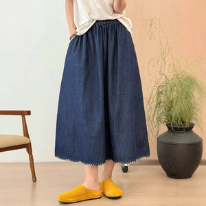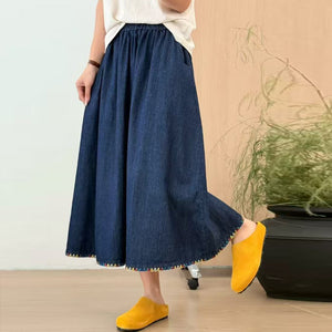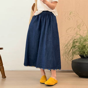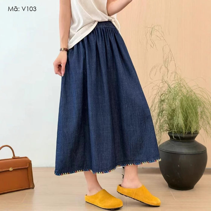 Chân váy denim lưng thun vạt thêu hoa - V103