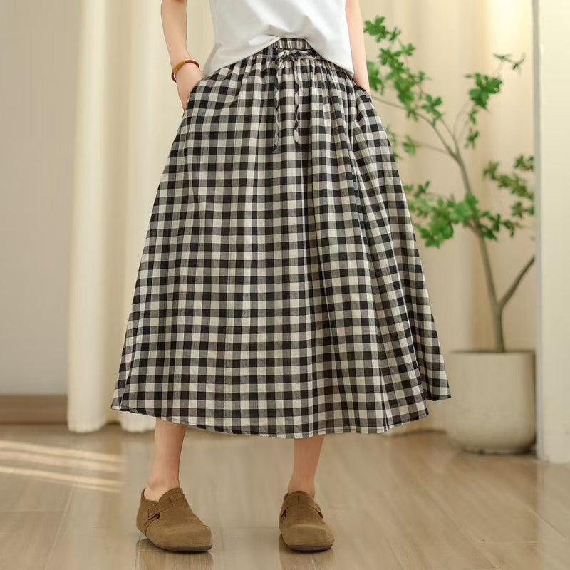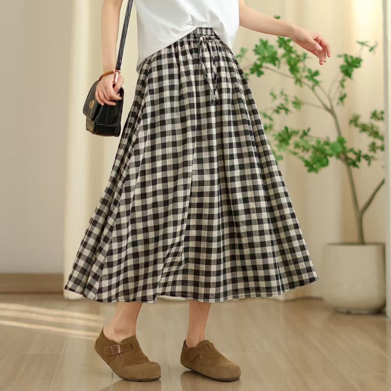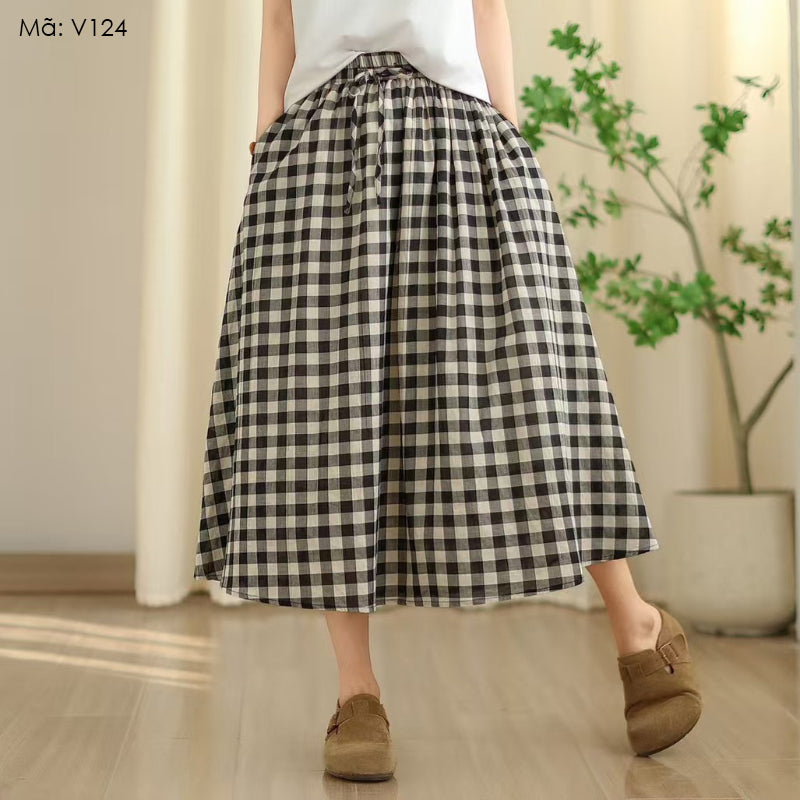 Chân váy linen lưng thun dây rút kẻ caro - V091