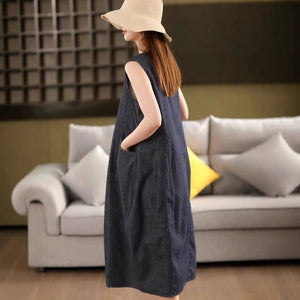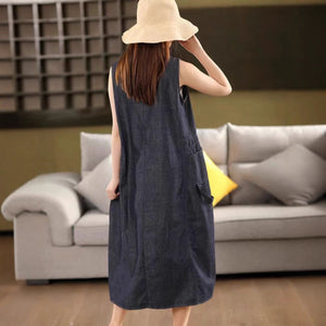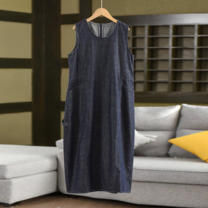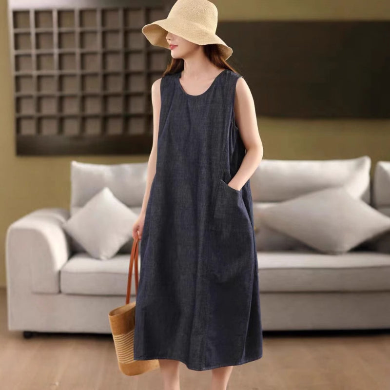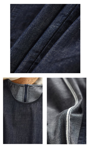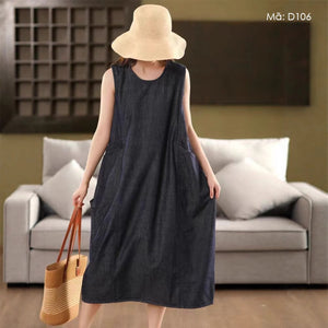 Đầm liền denim sát nách cổ tròn hai túi - D106