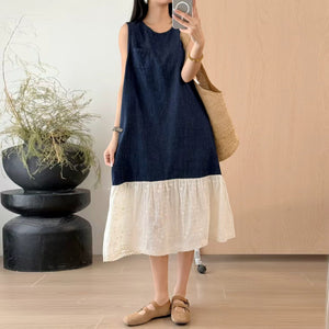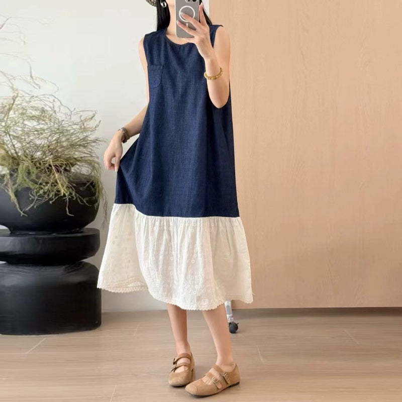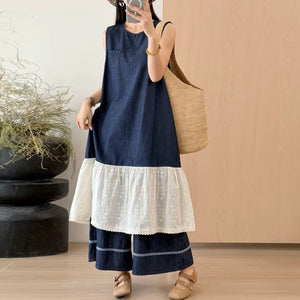 Đầm liền denim sát nách cổ tròn kiểu hai tầng - D083