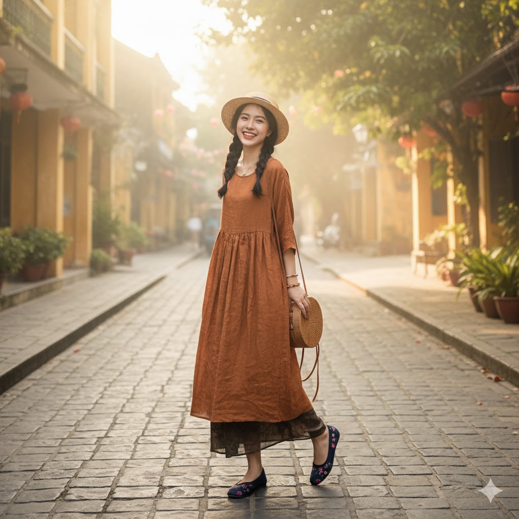 Đầm liền linen ngắn tay cổ tròn eo xếp ly dây rút - NU10425