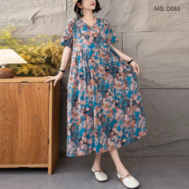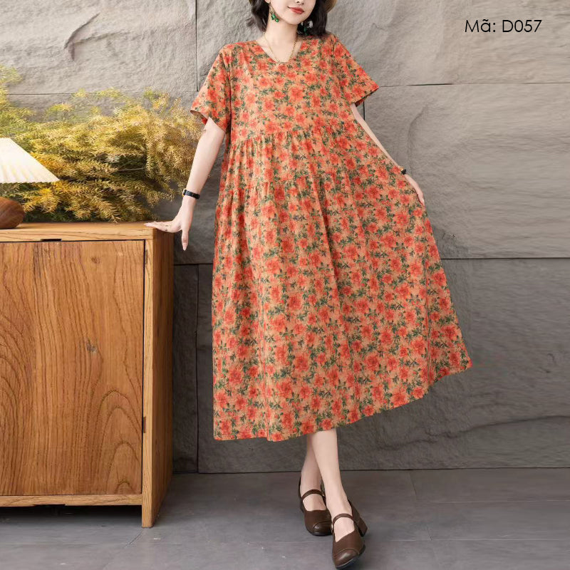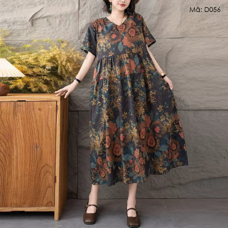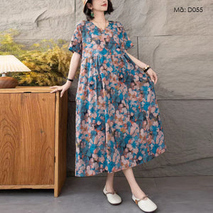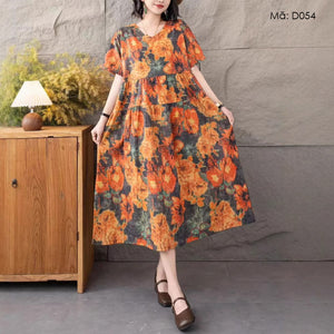 Đầm liền linen ngắn tay cổ V hoa văn retro - D054