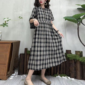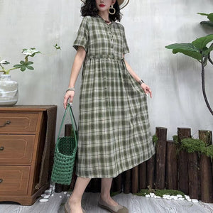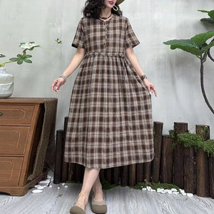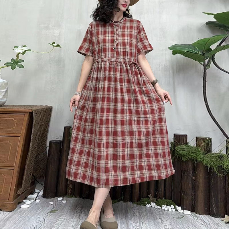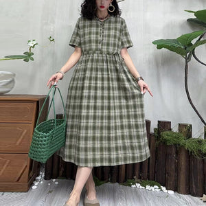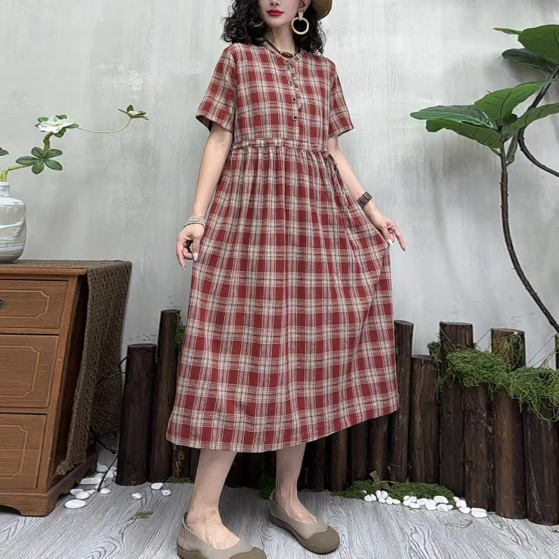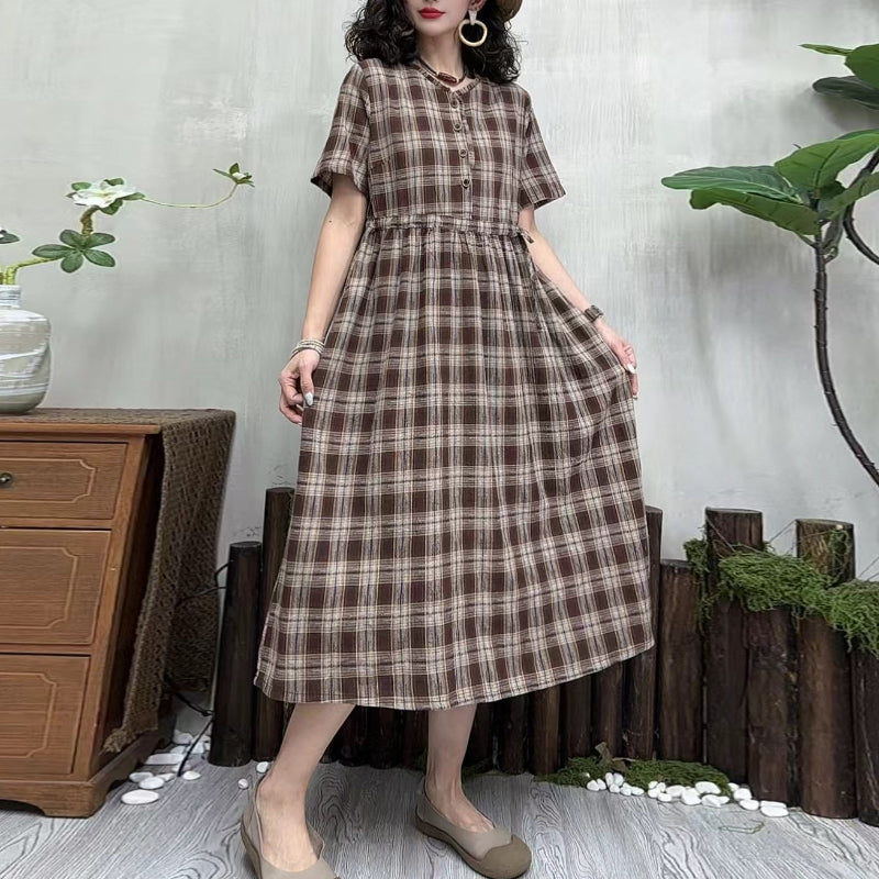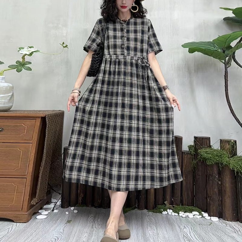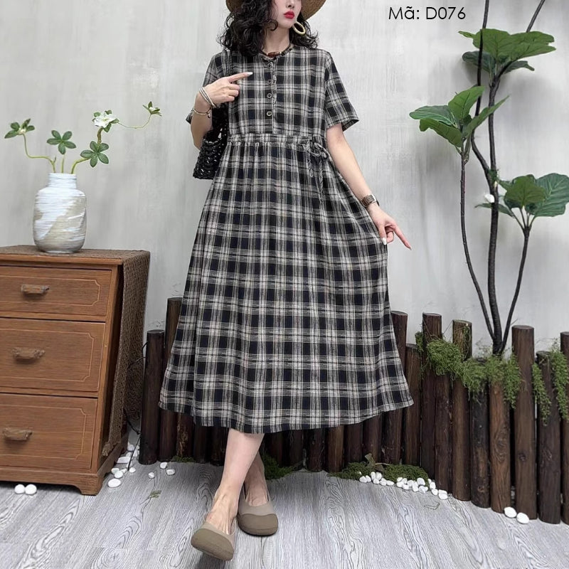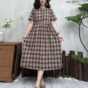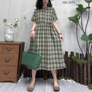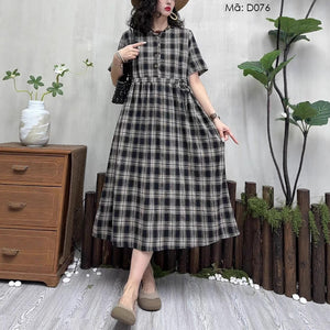 Đầm liền linen ngắn tay cổ V khuy cài kẻ sọc caro - D074