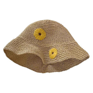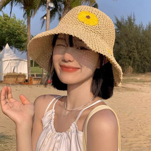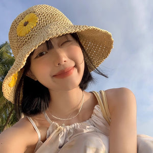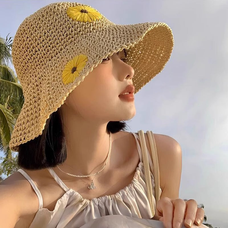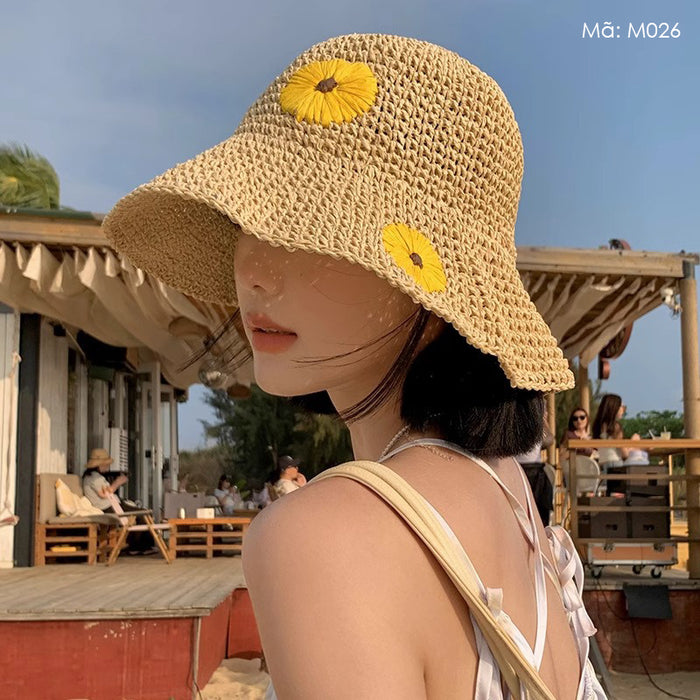 Mũ cói móc tay retro vành rộng gấp gọn thêu hoa - M026