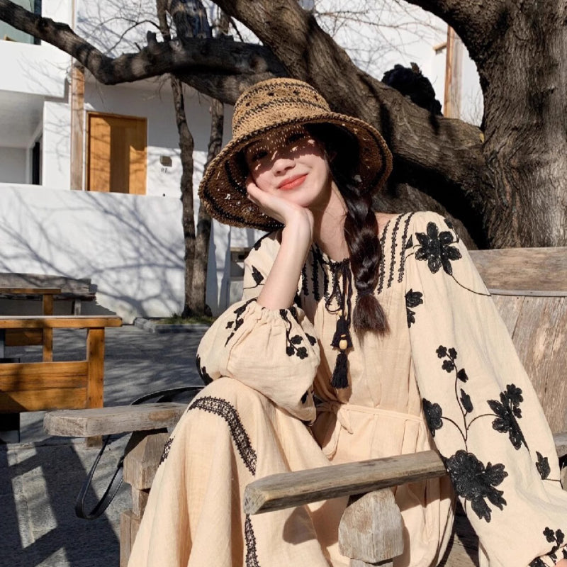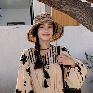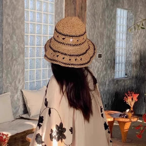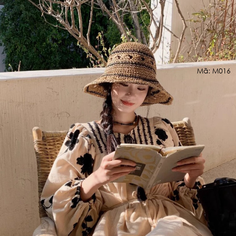 Mũ cói móc tay retro vành rộng phối viền - M016