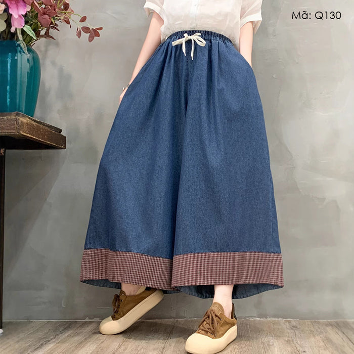 Quần baggy denim lưng thun ống rộng phối caro - Q129