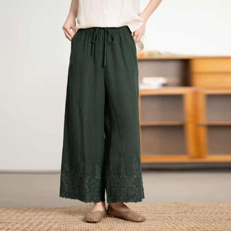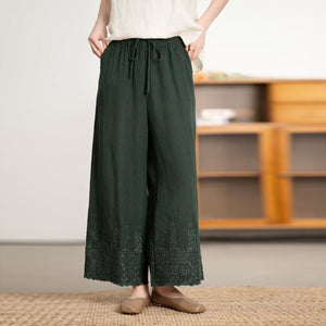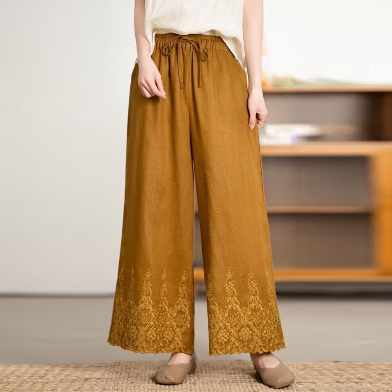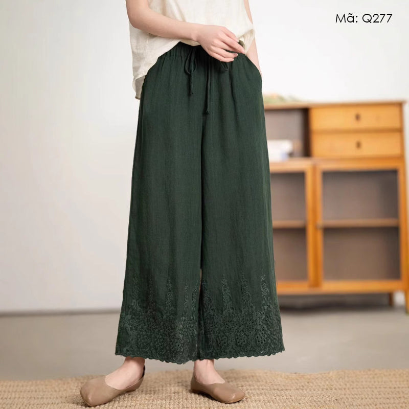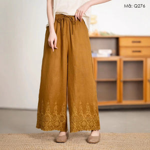 Quần baggy linen lưng thun thêu retro vạt gấu - Q276