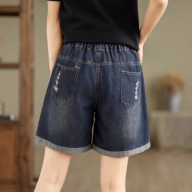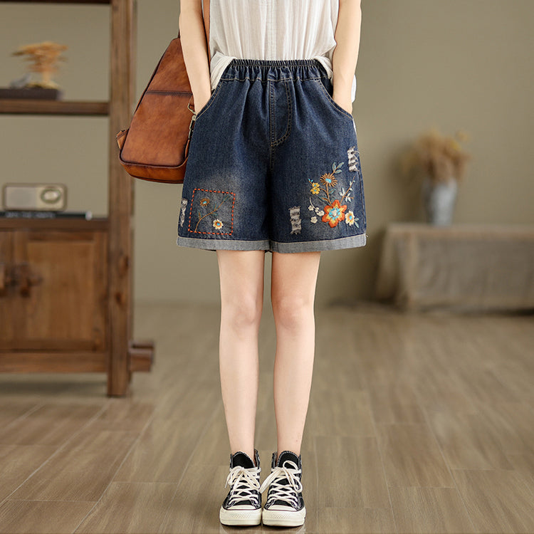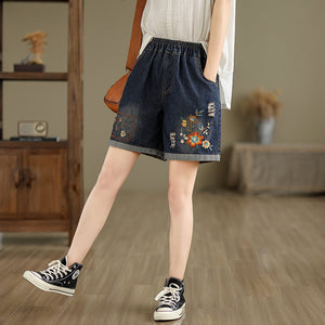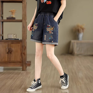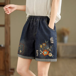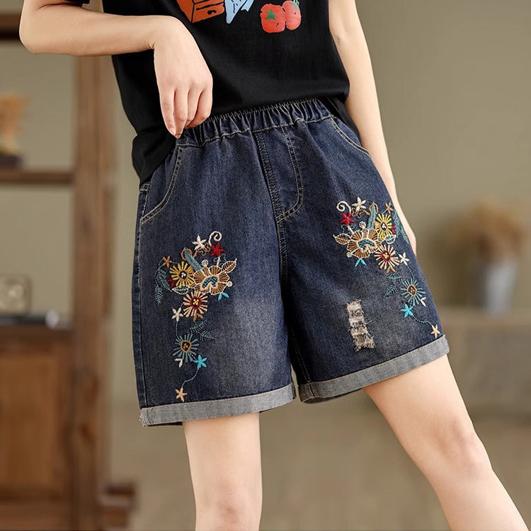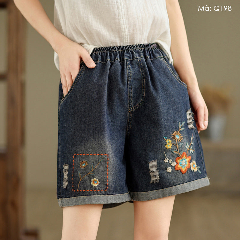 Quần sooc denim lưng thun cạp cao thêu hoa lá - Q198