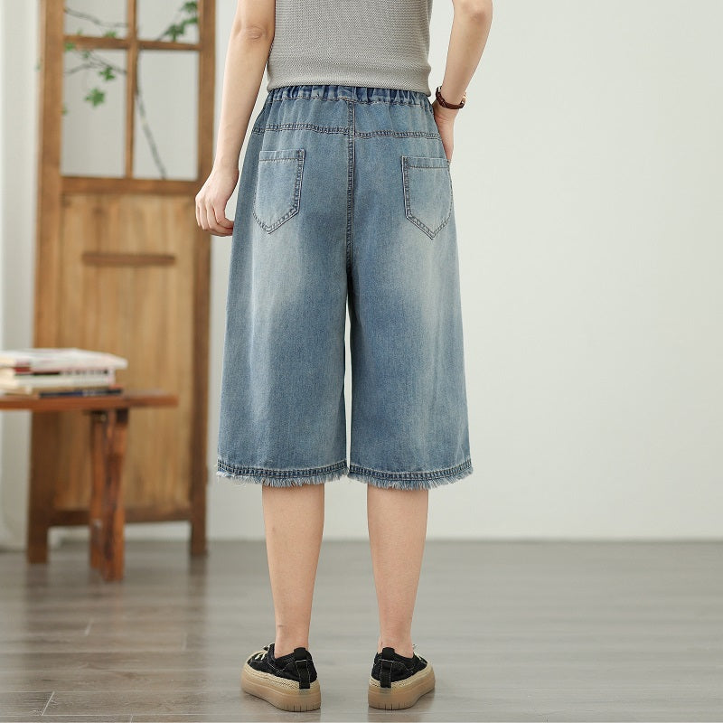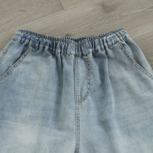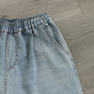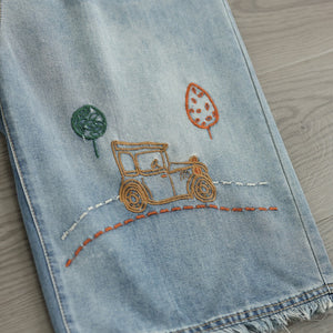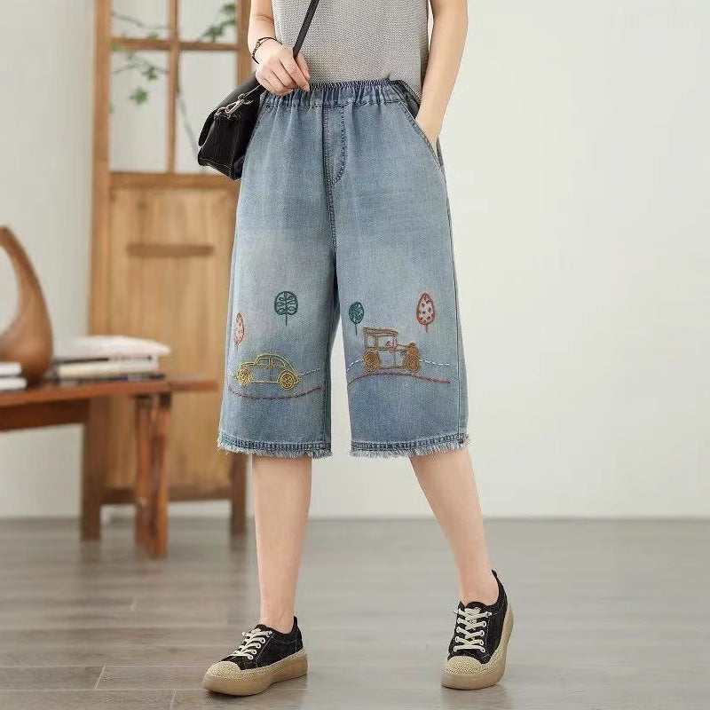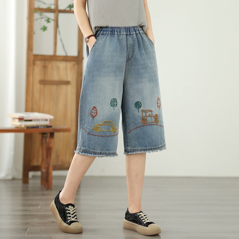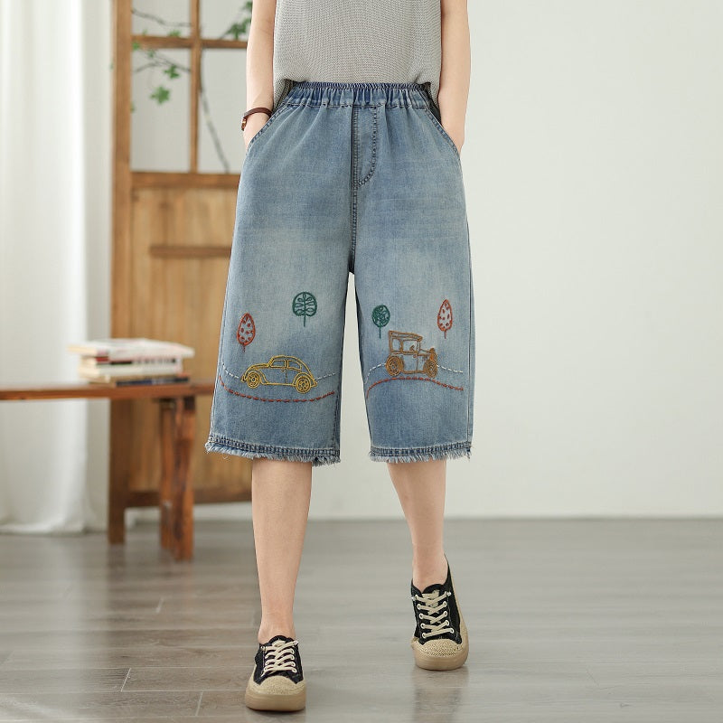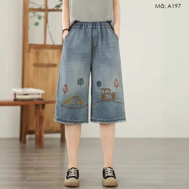 Quần sooc denim lưng thun thêu hai chiếc xe - Q197